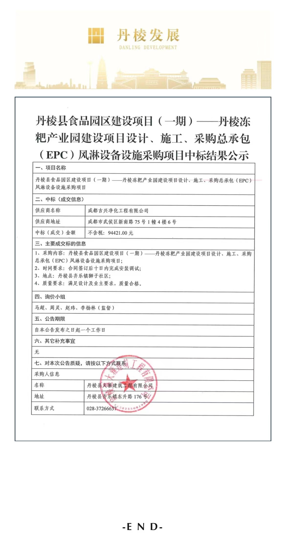 丹棱縣食品園區(qū)建設(shè)項目(一期)—丹棱凍粑產(chǎn)業(yè)園建設(shè)項目設(shè)計、施工、采購總承包(EPC)風(fēng)淋設(shè)備設(shè)施詢價采購項目中標(biāo)結(jié)果公示