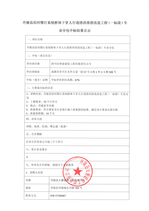 【大雅建筑公司】丹棱縣沿河慢行系統(tǒng)橋體下穿人行道排洪排澇改造工程(一標段)專業(yè)分包中標結(jié)果公示