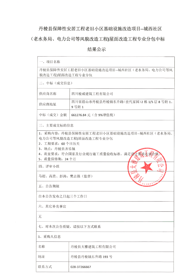 【大雅建筑公司】丹棱縣保障性安居工程老舊小區(qū)基礎設施改造項目--城西社區(qū)(老水務局、電力公司等風貌改造工程)屋面改造工程專業(yè)分包中標結果公示