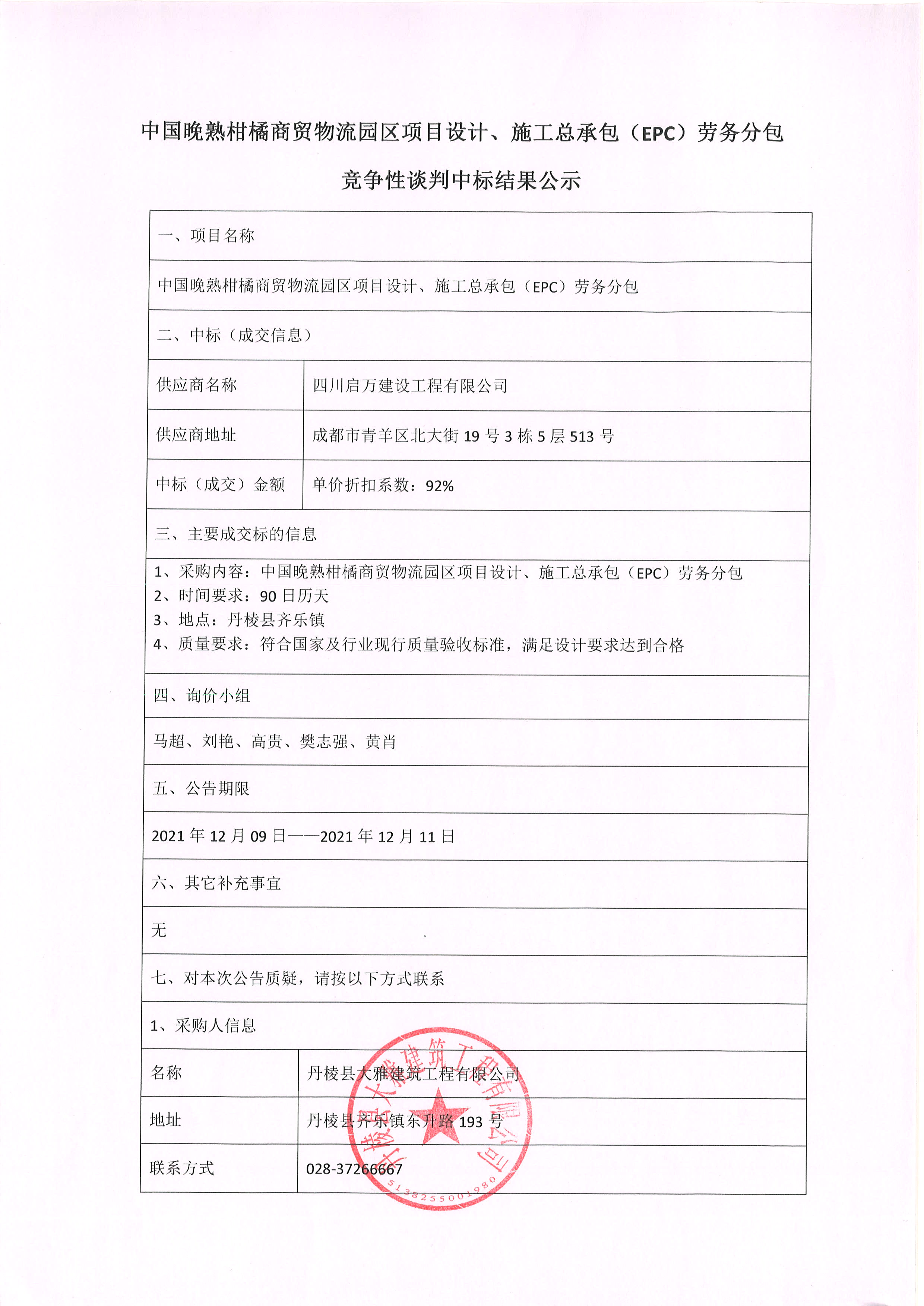 【大雅建筑公司】中國晚熟柑橘商貿(mào)物流園區(qū)項目設(shè)計、施工總承包(EPC)勞務(wù)分包競爭性談判中標結(jié)果公示