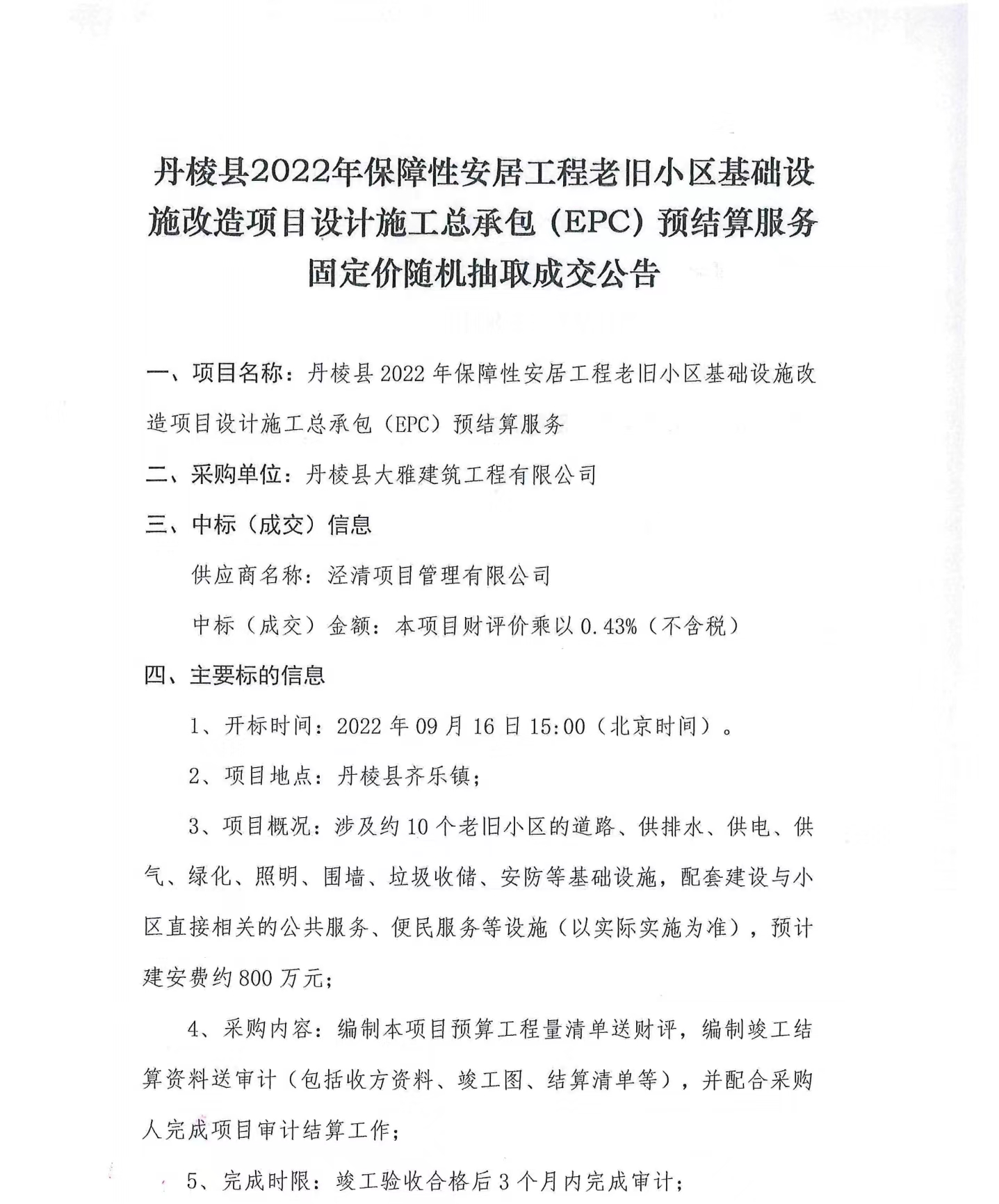 丹棱縣2022年保障性安居工程老舊小區(qū)基礎設施改造項目設計施工總承包(EPC)預結算服務固定價隨機抽取成交公告