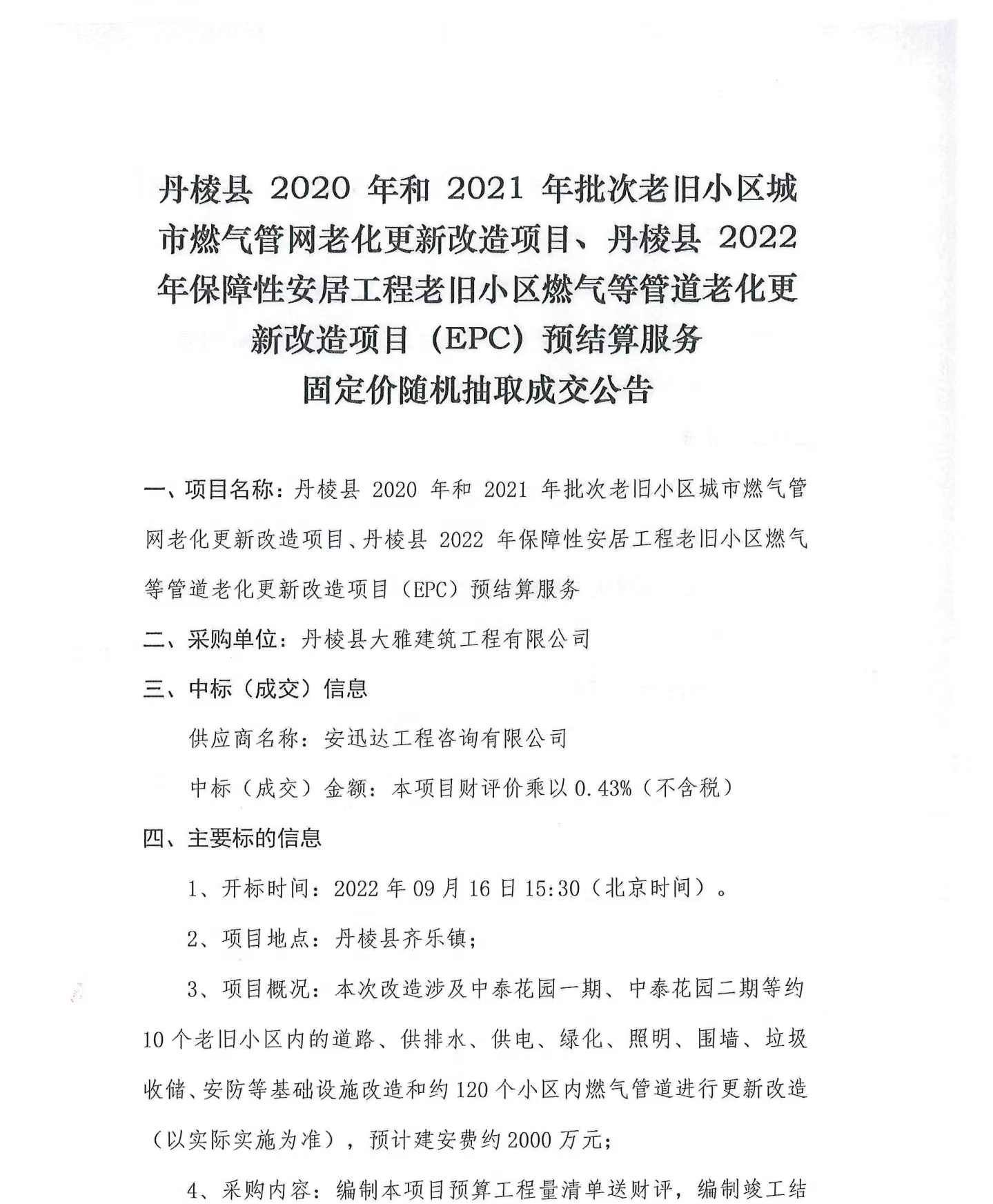 丹棱縣 2020 年、2021年及2022年批次老舊小區(qū)城市燃氣管網(wǎng)老化更新改造項目預結(jié)算服務固定價隨機抽取成交公告