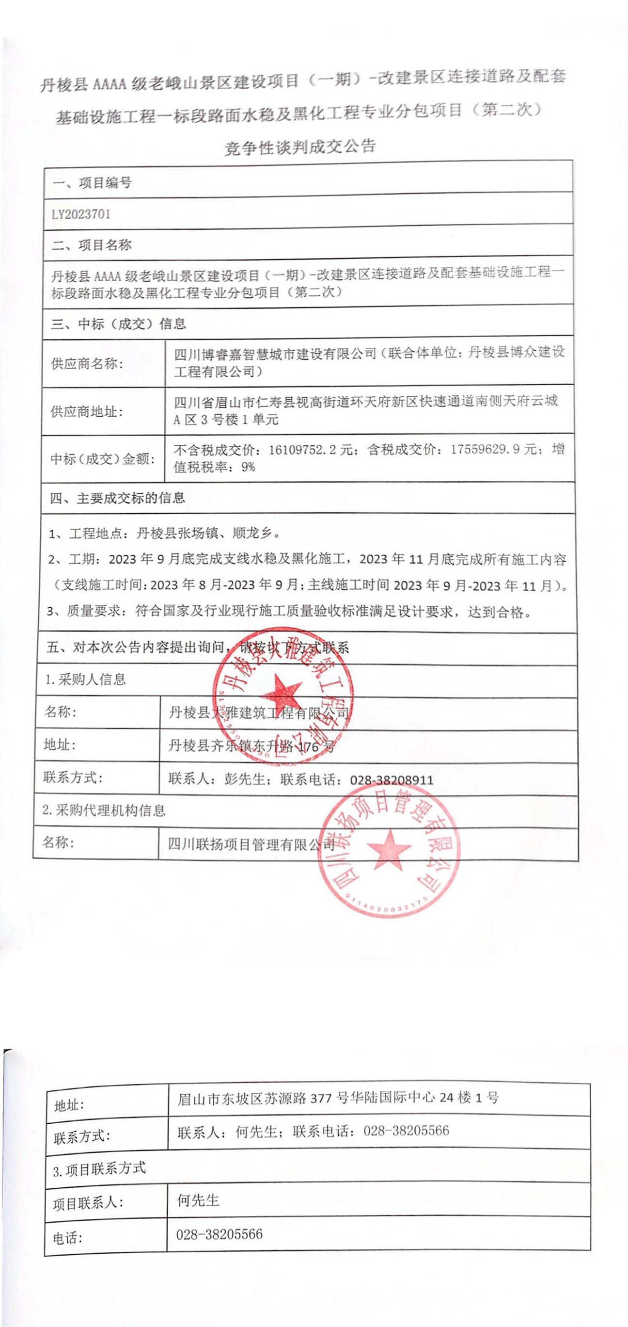 丹棱縣AAAA級老峨山景區(qū)建設(shè)項(xiàng)目(一期)—改建景區(qū)連接道路及配套基礎(chǔ)設(shè)施工程一標(biāo)段路面水穩(wěn)及黑化工程專業(yè)分包項(xiàng)目成交公告