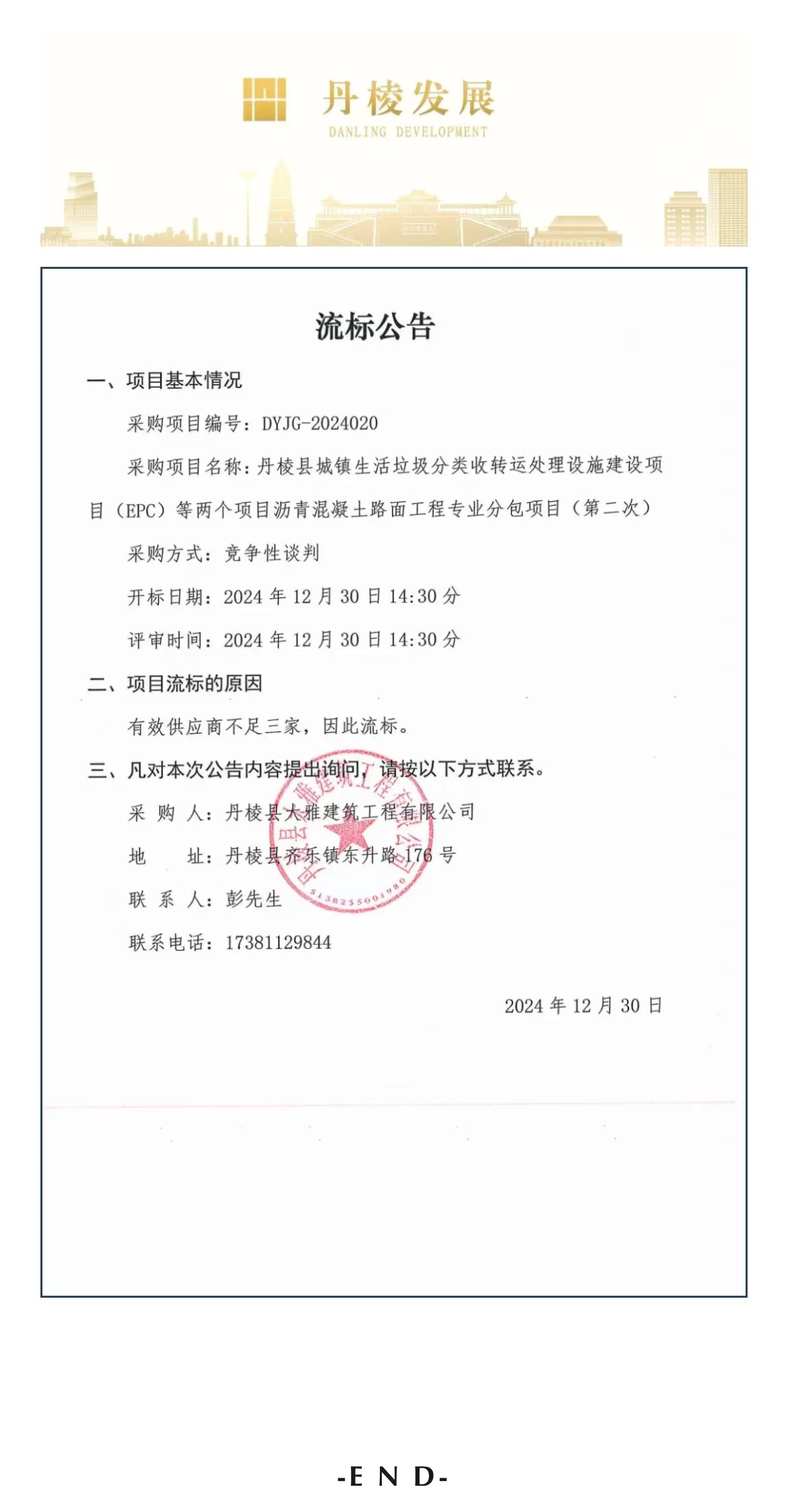 丹棱縣城鎮(zhèn)生活垃圾分類收轉(zhuǎn)運處理設(shè)施建設(shè)項目(EPC)等兩個項目瀝青混凝土路面工程專業(yè)分包項目(第二次)流標公告