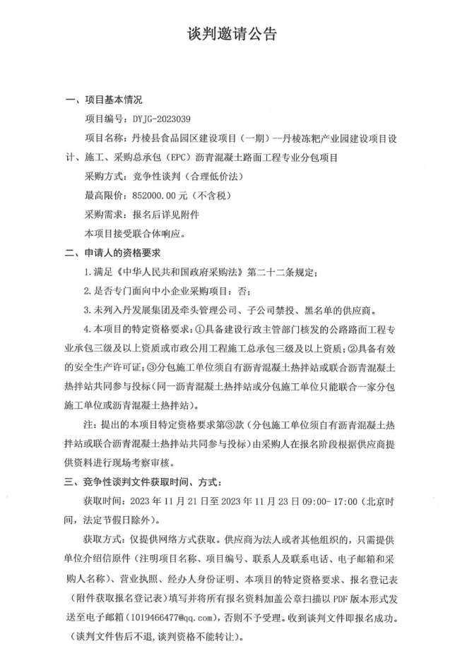 丹棱縣食品園區(qū)建設(shè)項(xiàng)目(一期)—丹棱凍粑產(chǎn)業(yè)園建設(shè)項(xiàng)目設(shè)計(jì)、施工、采購(gòu)總承包(EPC)瀝青混凝土路面工程專(zhuān)業(yè)分包項(xiàng)目談判邀請(qǐng)公告