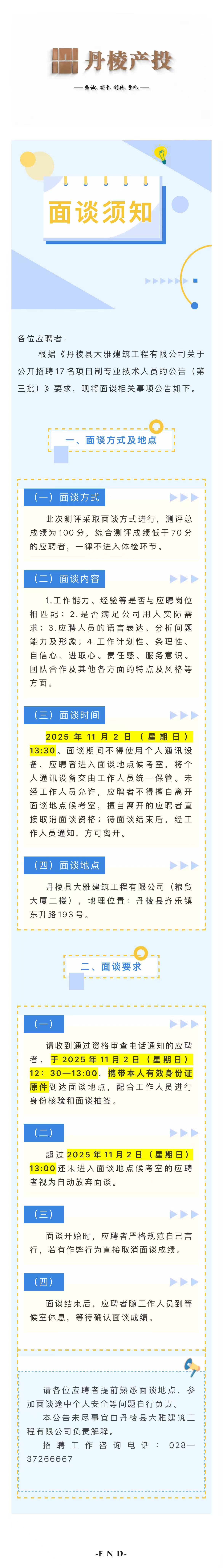 丹棱縣大雅建筑工程有限公司關于公開招聘17名項目制專業(yè)技術人員的面談須知(第三批)