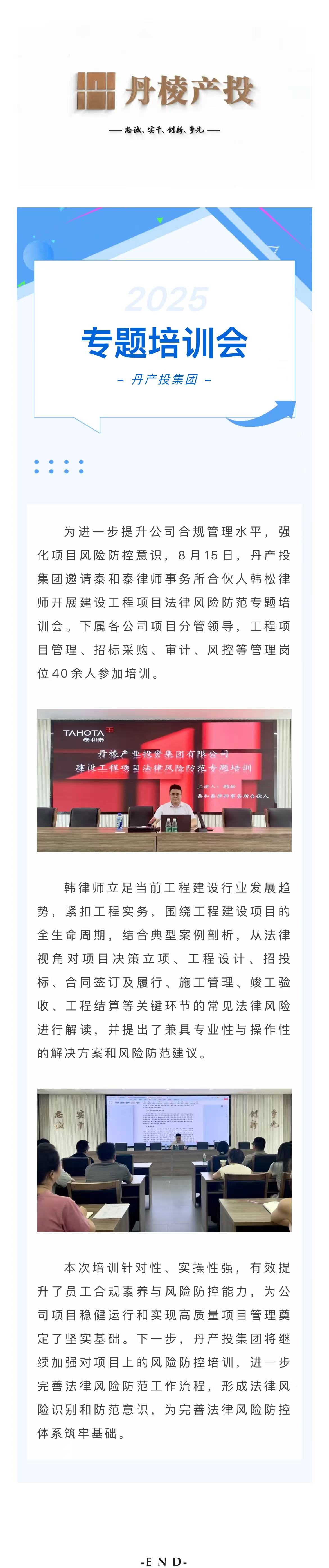 丹產(chǎn)投集團(tuán)開展建設(shè)工程項(xiàng)目法律風(fēng)險(xiǎn)防范專題培訓(xùn)會(huì)