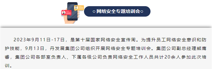 【網(wǎng)絡(luò)安全宣傳周】 丹發(fā)展集團(tuán)公司開(kāi)展網(wǎng)絡(luò)安全專題培訓(xùn)會(huì)